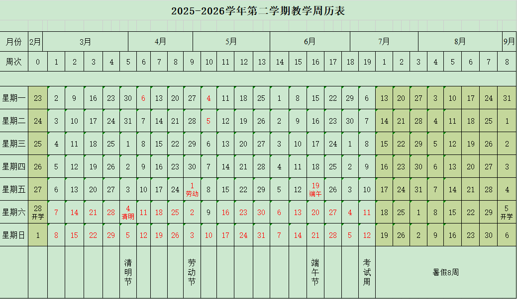 2025-2026学年第二学期周历表